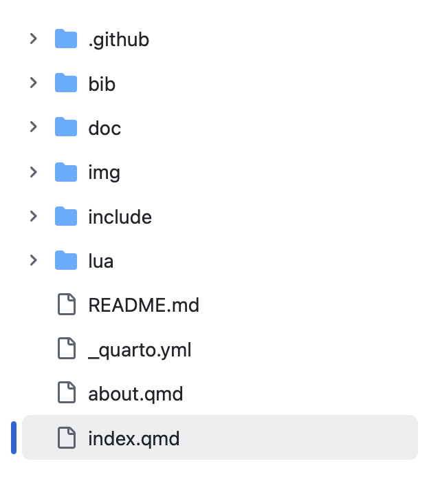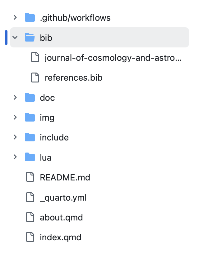 The main configuration for the website is handled inside the _quarto.yml file. You can customize this file to change the site’s title, logo, navigation sidebar, and bibliography settings: