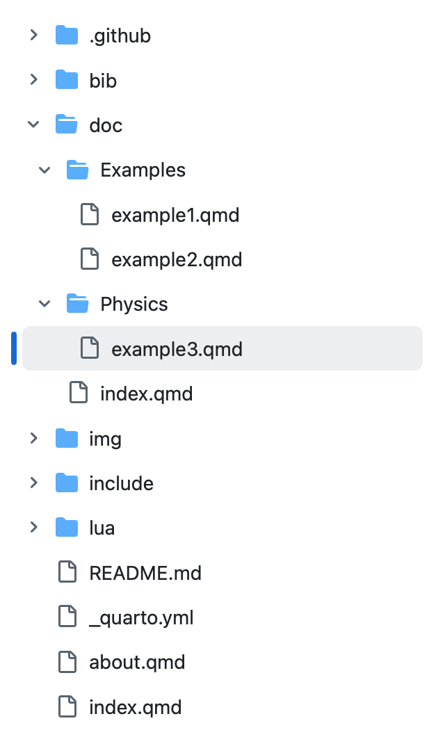 To add new pages to the wiki, simply create new plain text files (with .qmd extension) inside the doc/ folder. The system will automatically recognize the files and add them to the sidebar. The sidebar reproduces the exact folder structure inside the doc/ folder, so you can create drop-down menus simply by placing files inside sub-folders: