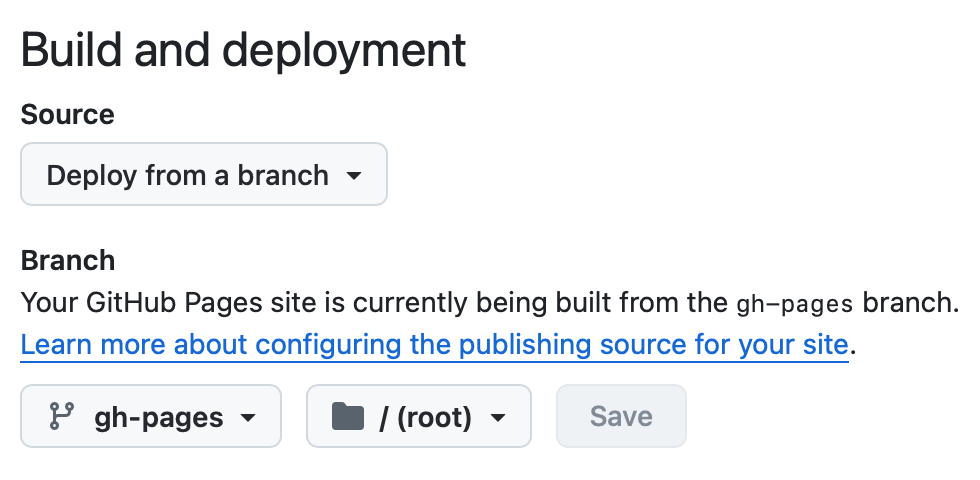 To enable website hosting, you need to create an empty branch called gh-pages. Then, navigate to your repository settings, go to the GitHub Pages section, and select the gh-pages branch as your build and deployment source: